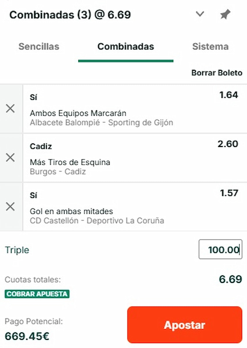 Con nuestras combinadas especiales que juntan pronósticos de diferentes partidos de LaLiga EA Sports y LaLiga Hypermotion, tendrás a tu disposición apuestas con cuotas más altas que, al mismo tiempo, representan mejores pagos. Echa un vistazo a continuación: