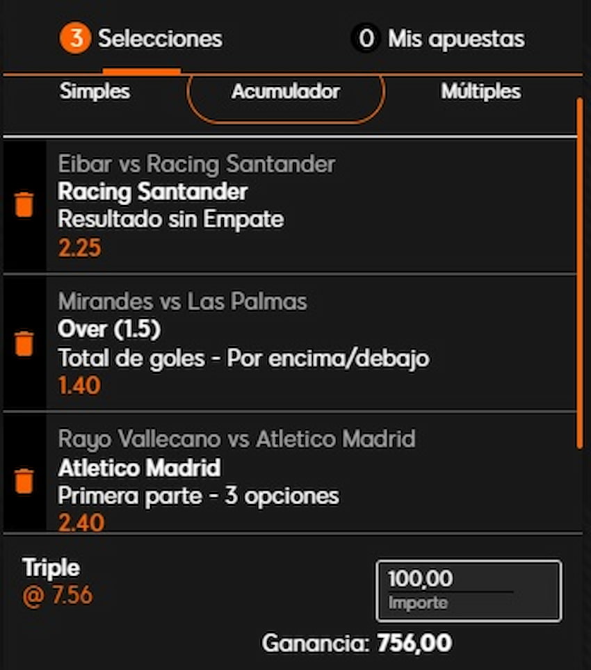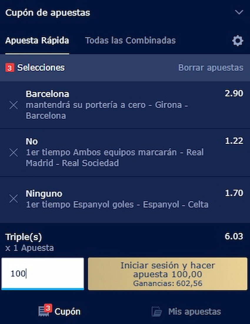 La casa de apuestas 888Sport ofrece una cuota total de 7.56 por esta triple. Si apuestas 100€ y aciertas todas las selecciones, tu premio será de 756€.